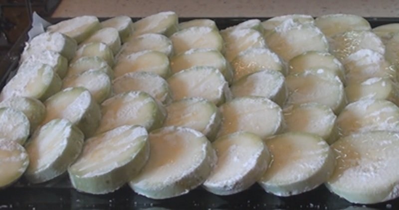 Umycie, wysuszenie i obtoczenie w mące pokrojonych kawałków cukinii. Ułożenie krążków na blaszce oraz posypanie ich przygotowanymi przyprawami. Pieczenie w 150 stopniach przez około 20 minut. Przygotowanie sosu ze śmietany, czosnku, soku z cytryny i ziół.