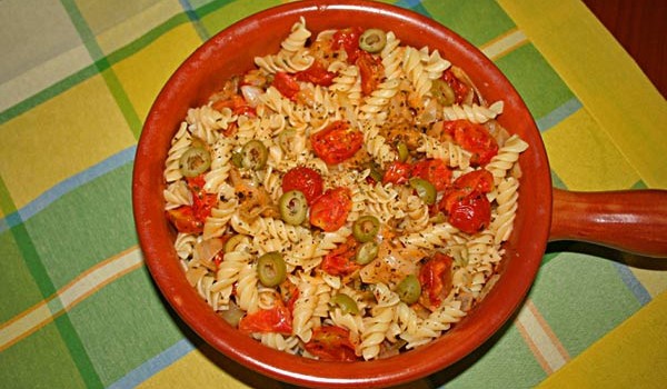 Szybki makaron z mozzarellą, oliwkami i pomidorami