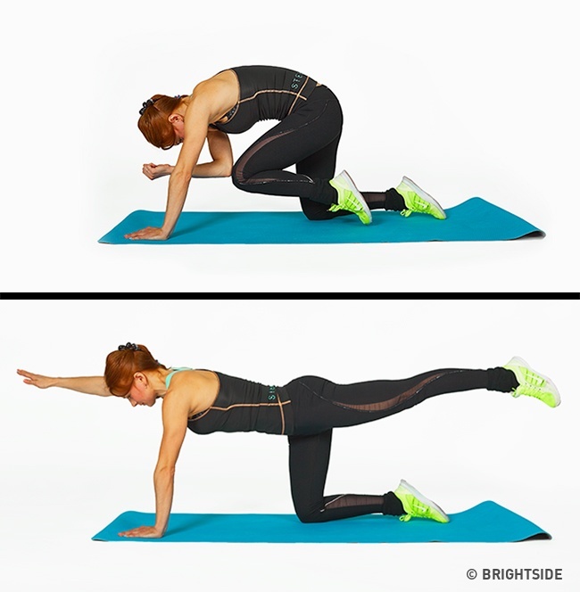 Zegnij rękę i nogę, postaraj się dotknąć łokciem kolana. Powtórz ćwiczenie na przeciwległych kończynach. Wzmocnisz tym ćwiczeniem swoje plecy, poprawisz zmysł równowagi i ruchomość stawów biodrowych.