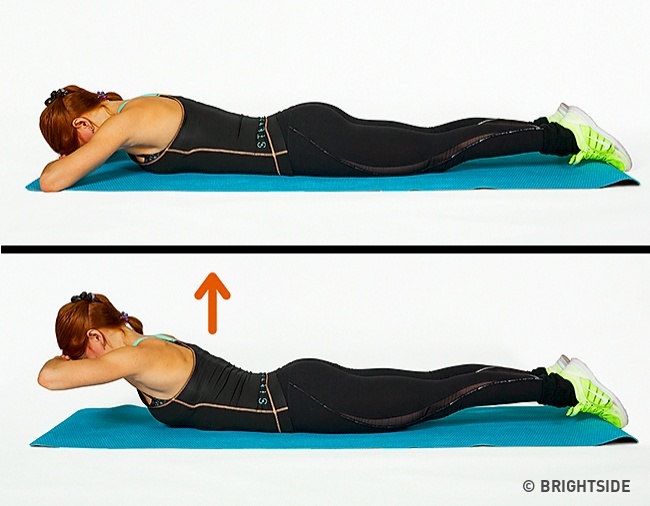 Połóż się na brzuchu. Ręce zegnij w łokciach i zapleć pod głową. Stopy trzymaj przyklejone do ziemi, górną część ciała podnieś do góry tak wysoko, jak tylko potrafisz. Wzmocnisz tym sposobem plecy i usprawnisz cały kręgosłup.