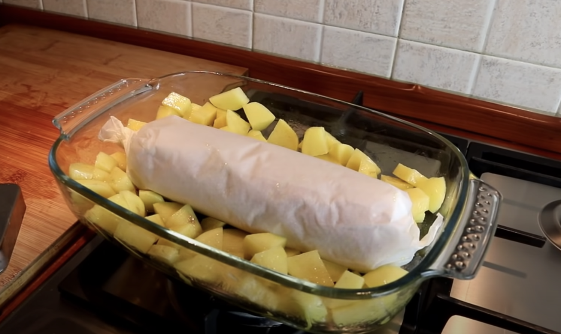 Na środku połóż ser, po czym połącz obydwa końce papieru do pieczenia, aby nadać mięsu kształt rolady. Następnie weź kolejny papier i zawiń w niego uformowaną wcześniej roladę.