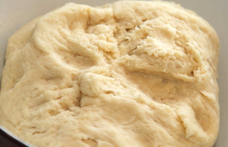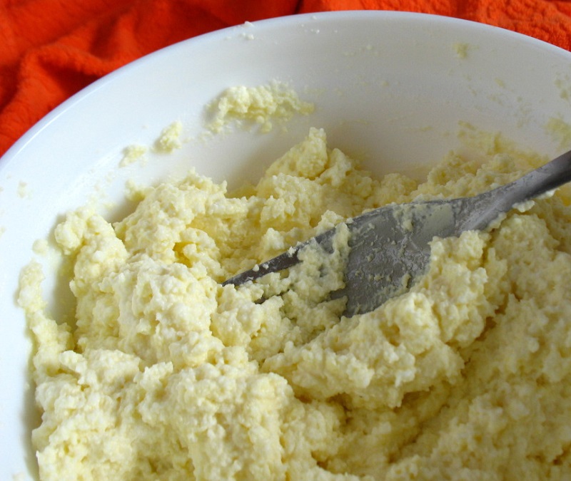 Roztopioną na patelni margarynę (100 g) łączymy z twarożkiem (250 g) oraz cukrem (1/2 szklanki). Dodatkowo dajemy jeszcze sól (1/2 łyżeczki) oraz żółtka jaj (2 sztuki).