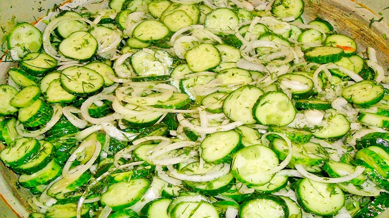 Dobrze opłucz ogórki, możesz też moczyć je przez 1 godzinę w zimnej wodzie. Ogórki pokrój w pół-pierścienie, cebulę obierz i umyj oraz pokrój również na pół-pierścienie. Umieść ogórki i cebulę w dużej misce. Dopraw solą i odstaw na 30 minut, aby ogórki puściły sok. Umyj koperek i drobno posiekaj.