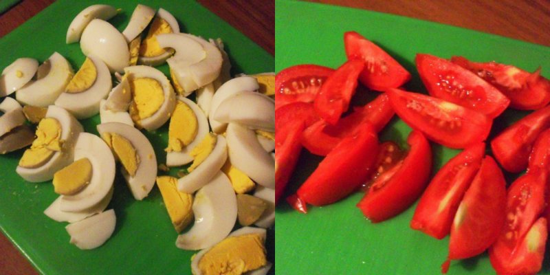 Poczekaj, aż cukinia wystygnie, przetnij wszystkie pierścienie na połowy i wrzuć do miski. Umyj pomidory, pokrój je w łódeczki i także wsyp do miski z cukinią.