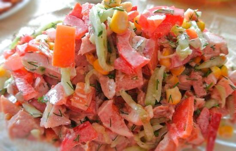 Gotujemy około 300 g filetów z kurczaka (jeden duży lub dwa mniejsze), po czym kroimy je w cienkie paseczki. Do mięsa dodajemy, również pocięte w paski, ogórek, pomidor i paprykę oraz wsypujemy 2-3 łyżki kukurydzy z puszki. Sałatkę doprawiamy jogurtem naturalnym z solą, pieprzem i odrobiną ziół prowansalskich.