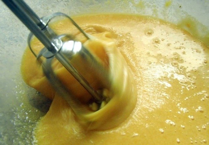 Należy wcześniej roztopić masło w rondelku. Masło odstawiamy do ostygnięcia. Utrzyj jajka z cukrem do powstania gęstej masy. Najszybciej można to zrobić mikserem.