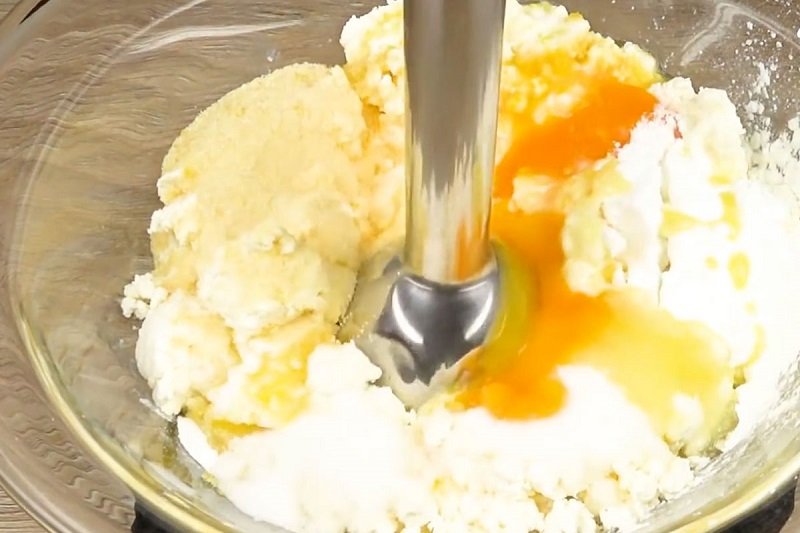 Wymieszaj razem twaróg, żółtka, cukier, kasze mannę, proszek do pieczenia, wanilię, skrobię, skórkę i sok z cytryny oraz masło. Ubij delikatnie blenderem, aż masa będzie gładka.