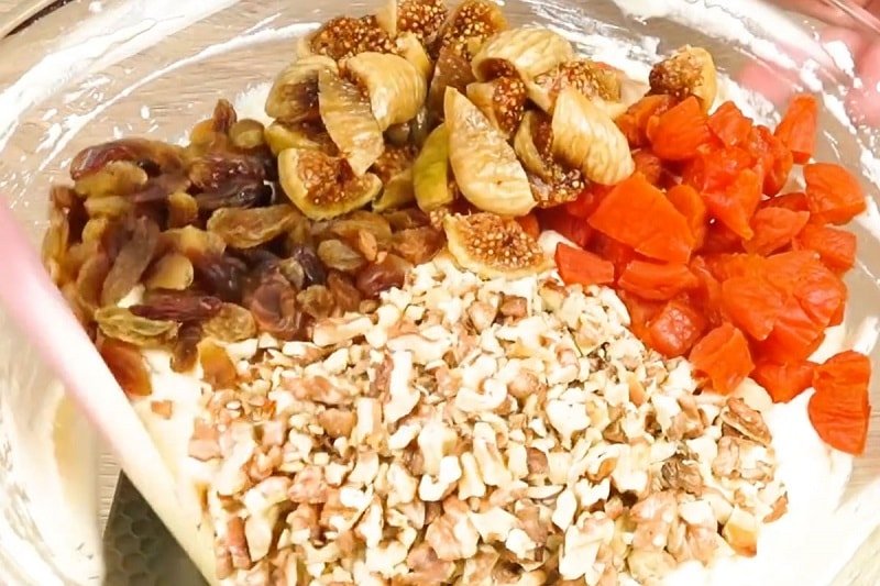 Białka ubij oddzielnie ze szczyptą soli, kolejno wymieszaj z masą twarogową. Teraz możesz dodać rodzynki, suszone morele, orzechy i figi. Wszystko wymieszaj. Następnie przygotuj foremkę do pieczenia. Posmaruj ją masłem i wlej masę twarogową. Wyrównaj powierzchnię i posmaruj kwaśną śmietaną.