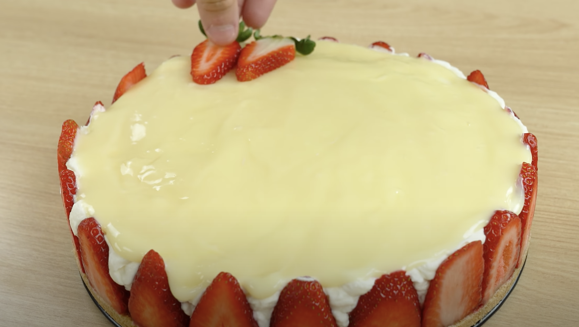Ubij śmietankę. Schłodzony krem budyniowy ​​wymieszaj z ubitą śmietaną. Włóż część kremu do formy, ułóż na nim pokrojone truskawki, przykryj kolejną częścią kremu.