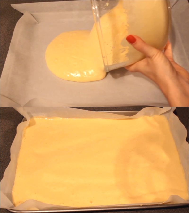 Blachę do pieczenia posmarować masłem i wyłożyć papierem. Ciasto należy wylać na nią i włożyć do rozgrzanego piekarnika, piec 12 minut.