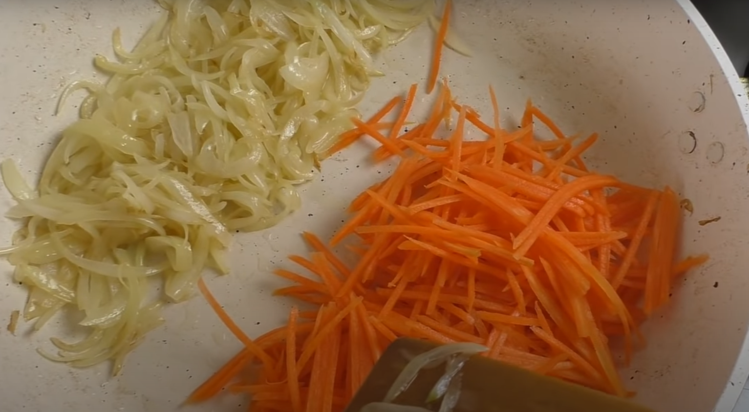 Zacznij od pokrojenia cebuli w paski, a następnie podsmaż ją na oleju. Posiekaj marchew i podsmaż ją na tej samej patelni, co cebulkę, ale nie mieszaj obu warzyw razem.