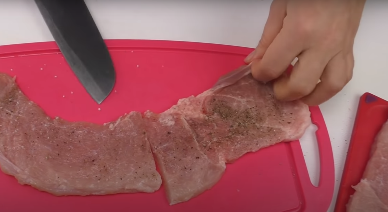 Po odpowiednim przykryciu mięsa rozbij je na cienkie plastry, a następnie przypraw je solą i pieprzem po obu stronach.