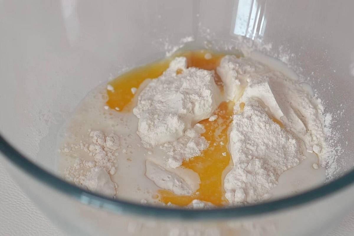 Należy zacząć od przygotowania ciasta na placki. W tym celu najpierw rozpuść masło, a następnie połącz je i wymieszaj z pozostałymi składnikami – mlekiem oraz masłem. Dopraw solą do smaku.