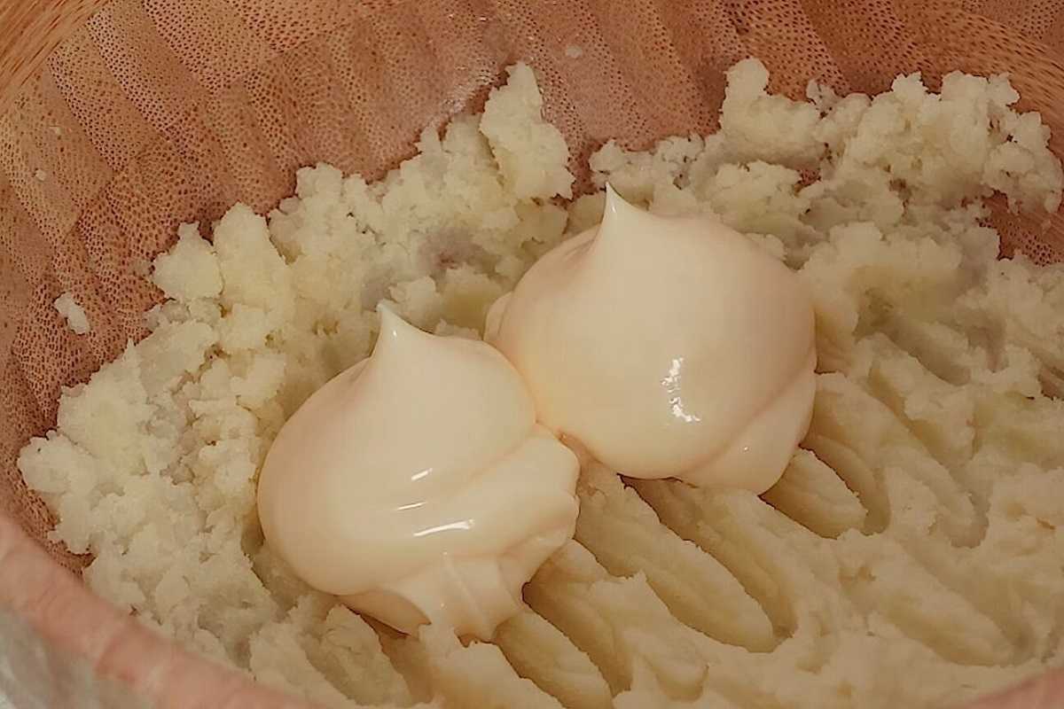 Do startych ziemniaków dodaj majonez i razem wymieszaj. Wyjmij ciasto z lodówki i cienko rozwałkuj przy pomocy wałka.
