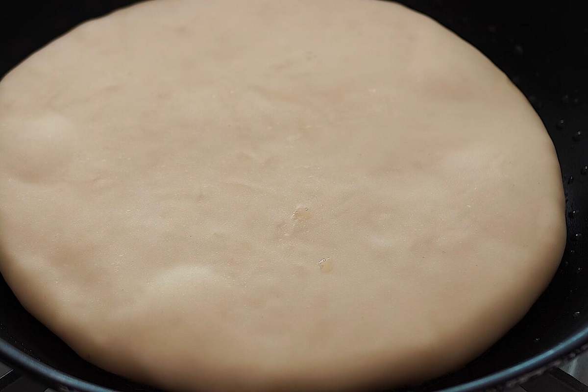 Placek piecz na małym ogniu na wysmarowanej wcześniej tłuszczem patelni, aż do zrumienienia z obu stron na złoty kolor.