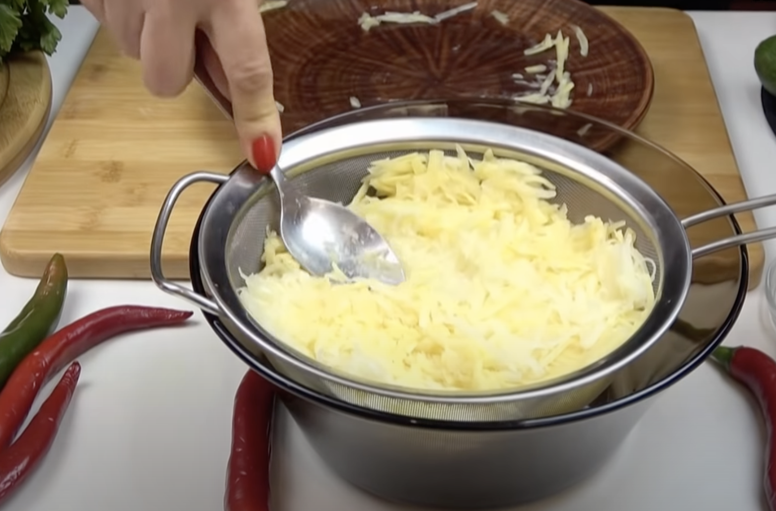 Ziemniaki obieramy, następnie należy zetrzeć je na tarce. Układamy je na sitku i wyciskamy sok.