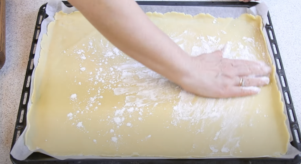 Upewnij się, że masz gładką powierzchnię i posyp ją mąką, aby ciasto nie przyklejało się do stolnicy. Następnie rozwałkuj jedną porcję ciasta.