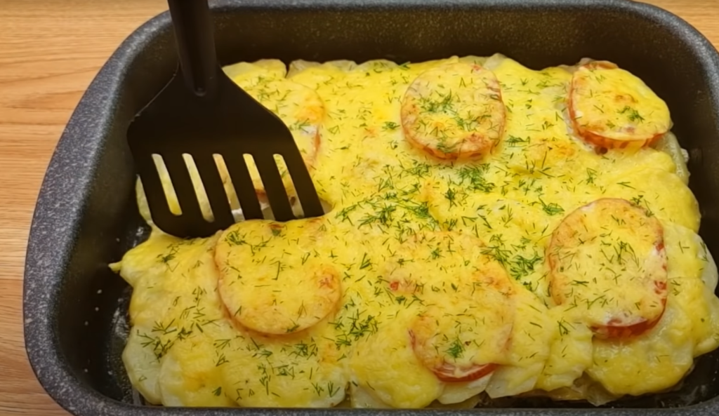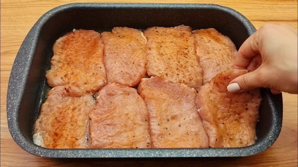 Pieczone plastry wieprzowiny z pieczarkami, ziemniakami, pomidorami i serem. Każda gospodyni musi znać ten przepis.