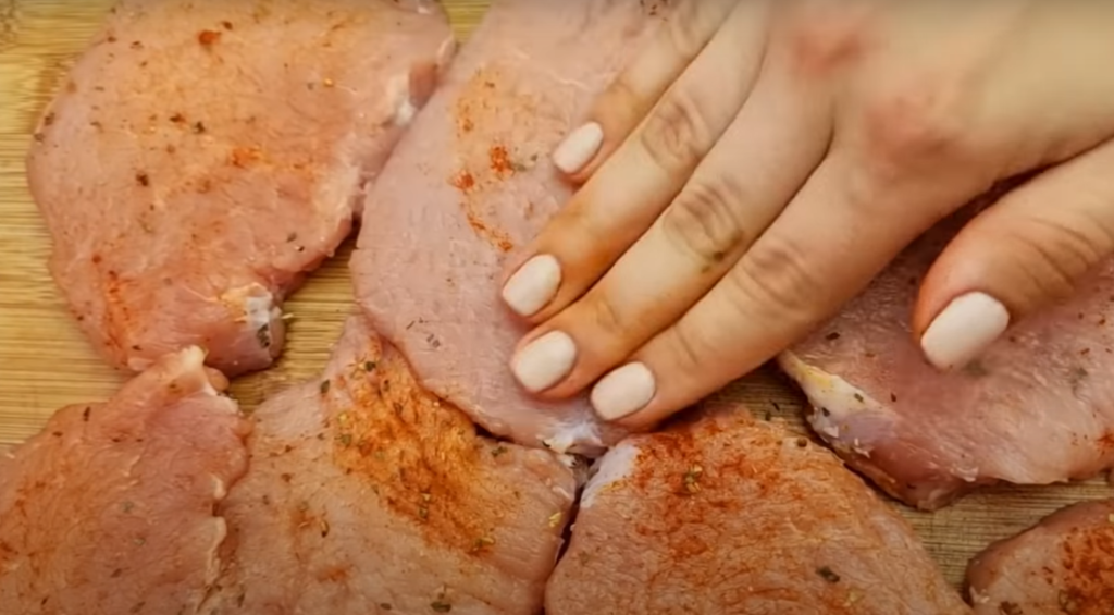 Pokrój wieprzowinę na grubsze plastry, przykryj folią spożywczą i rozbij za pomocą tłuczka. Posyp solą i przyprawami z obu stron i dobrze natrzyj.