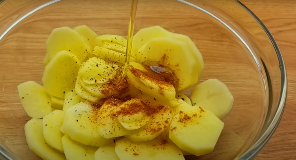Cebulę obierz, pokrój w półpierścienie i podsmaż na odrobinie oleju. Pieczarki pokrój na mniejsze kawałki i również podsmaż. Ziemniaki umyj, pokrój w kółka, włóż do miski i dopraw solą i przyprawami. Dodaj trochę oleju i wymieszaj.