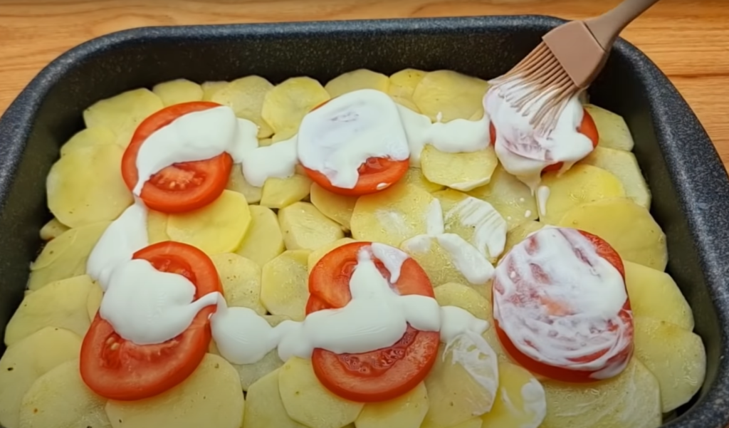Plastry mięsa ułóż obok siebie na wysmarowanej olejem blasze do pieczenia. Posmaruj przecierem pomidorowym, połóż na nich przesmażoną cebulę z pieczarkami. Ułóż pokrojone w plastry ziemniaki, pokrojone pomidory i posmaruj śmietaną.