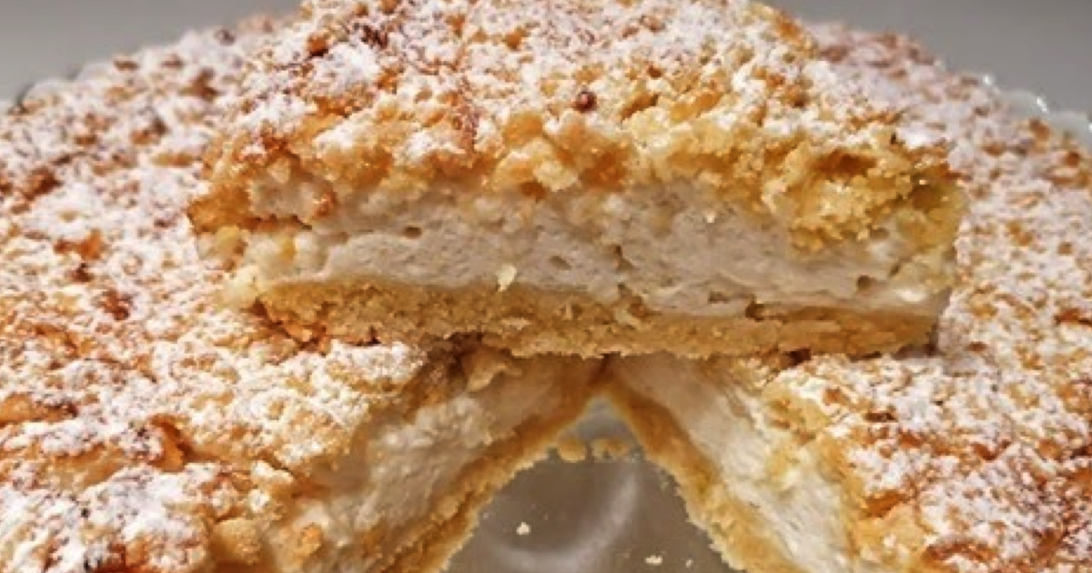 Gotowy krem przełożyć do przygotowanej wcześniej formy. A następnie drugą połowę ciasta zetrzeć na tarce, przykrywając krem.