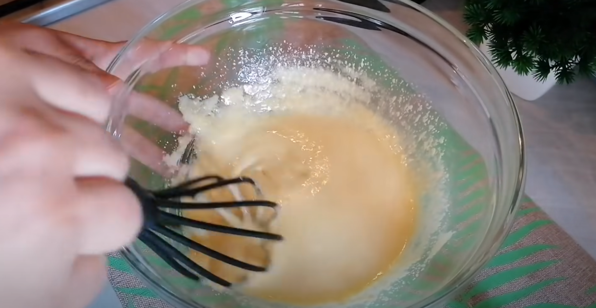 Cukier i 2 żółtka dodać do głębokiego naczynia, np. miski oraz dokładnie wymieszać.