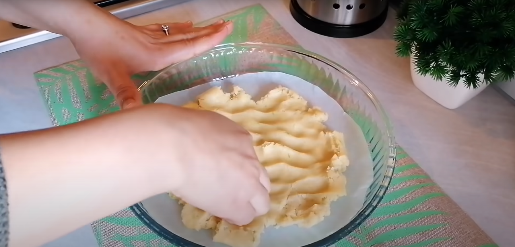 Naszykować formę do ciasta i wyłożyć ją papierem do pieczenia. A następnie wyjąć z zamrażarki połowę ciasta i równomiernie rozłożyć na dnie formy do pieczenia.