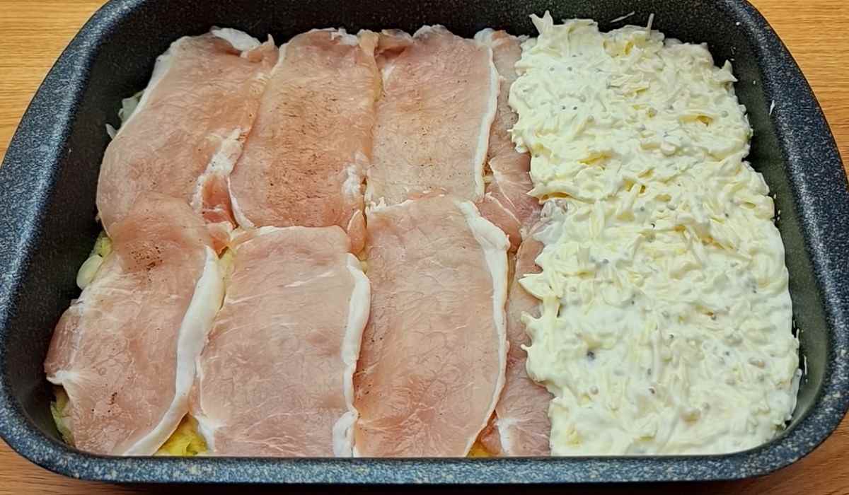 Gdy to zrobimy układamy kolejną warstwę tym razem z kawałków mięsa. W międzyczasie należy przygotować sos.