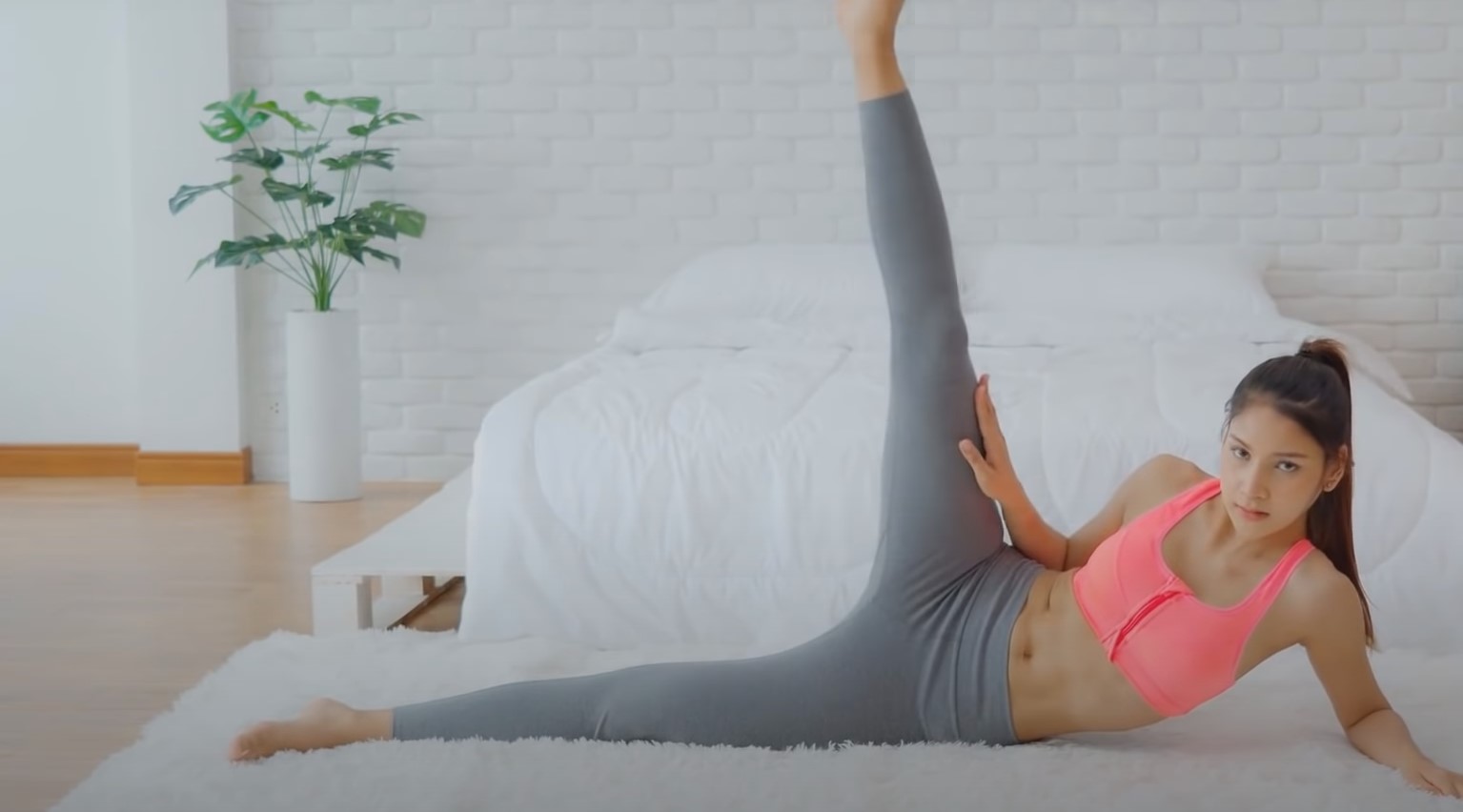 Połóż prawy bok na ziemi i oprzyj łokieć na łokciu. Wyprostować nogi. Prosta noga powinna być uniesiona jak najwyżej. Kontynuuj ćwiczenie przez 30 sekund, a następnie zmień stronę.