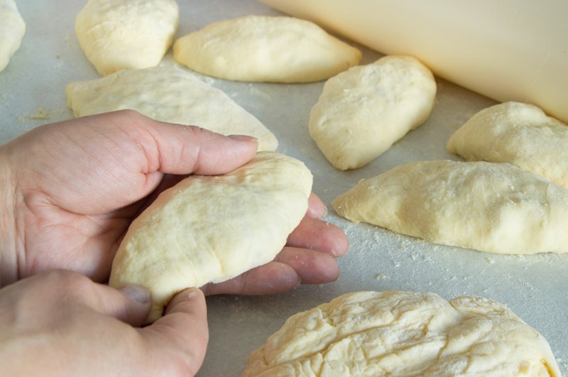 Ciasto drożdżowe wyciągnij z miski i połóż na oprószonej mąka stolnice. Zagnieć. Odrywaj kawałki ciasta i formuj z nich podłużne bułeczki o grubości około pół centymetra. Na środku ciasta połóż nadzienie i ponownie formuj bułeczki. Odstaw na stolnicę i przykryj je ściereczką.