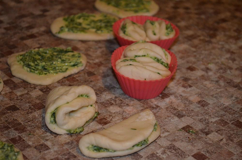 Kiedy ciasto już wyrosło, zwijamy je w rulon (kiełbaskę), a potem kroimy w plasterki. Każdy plaster rozwałkowujemy na małą porcję okrągłego ciasta i na środek wykładamy niewielką ilość masła z czosnkiem i ziołami.