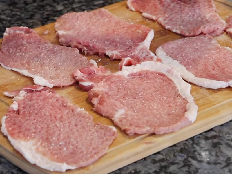 Oczyszczone mięso pokrój w dość cienkie plastry. Powinny mieć one mniej więcej 1 cm grubości. Rozbij tłuczkiem z obu stron, oprósz solą i pieprzem. Zamknij w szczelnym pojemniku i odstaw do lodówki na około 15 minut.