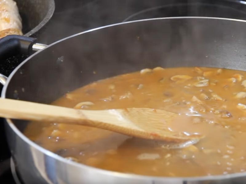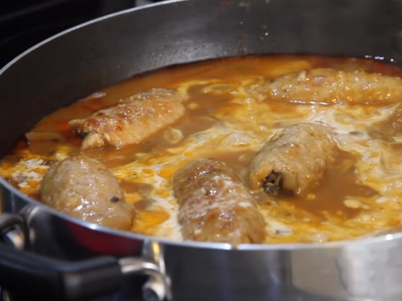 Przełóż roladki z powrotem na patelnię z sosem. Powinny one być całkowicie zanurzone w sosie. Przykryj patelnię i duś całość na małym ogniu przez mniej więcej 40 minut. Po tym czasie mięso stanie się przyjemnie kruche i przesiąknie aromatem cebuli oraz innych przypraw.